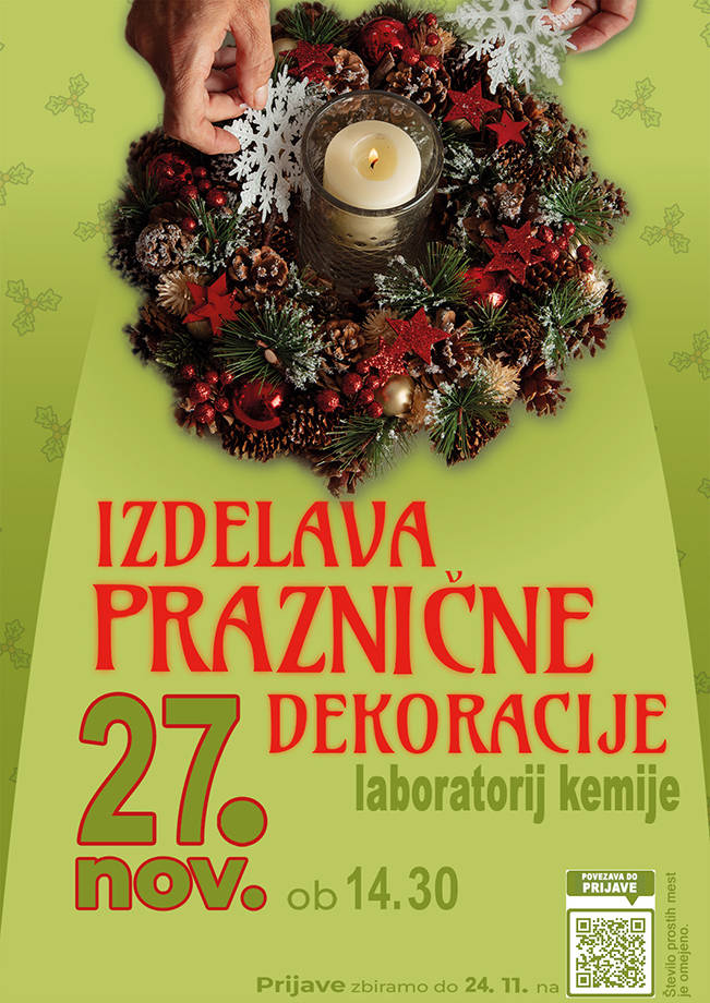 Delavnica IZDELAVA PRAZNIČNE DEKORACIJE bo v četrtek, 27. novembra 2025, ob 14.30 v laboratoriju kemije. Prijavite se lahko v spletni učilnici pod "Krožki in delavnice" podpostavka "Delavnice" ali klikni na PRIJAVA.